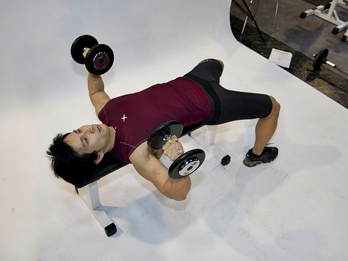 덤벨로 벤치프레스를 하면 바벨보다 가동 범위가 더 넓어져서 대흉근 안쪽과 바깥쪽까지 모두 자극할 수 있습니다. 대신 다룰 수 있는 중량은 바벨에 비해 많이 줄어들게 되니 너무 무겁지 않은 무게로 진행합니다. 호흡은 벤치프레스와 동일하게 덤벨을 내릴 때 들이마시고 근육을 수축하며 덤벨을 올릴 때 내쉽니다. 12회 정도 진행할 수 있는 중량을 찾아서 3~5세트 진행합니다.